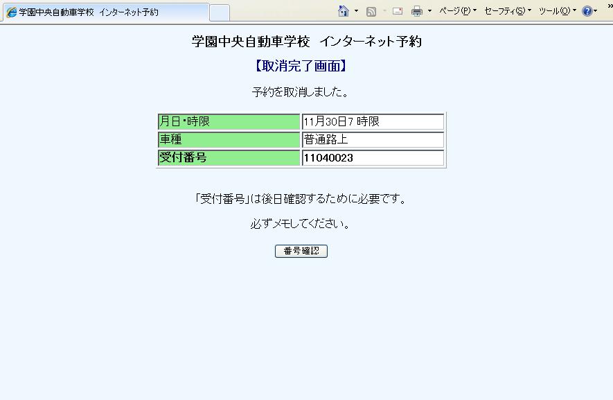 予約を取消できると画面に受付番号が表示されるので、後日確認するために必ずメモしてください。